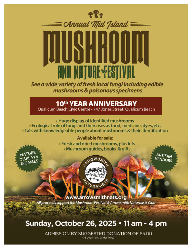 Saturday & Sunday, October 25th & 26th, the Arrowsmith Naturalists present the 10th Annual Mushroom & Nature Festival at the Qualicum Beach Civic Centre.