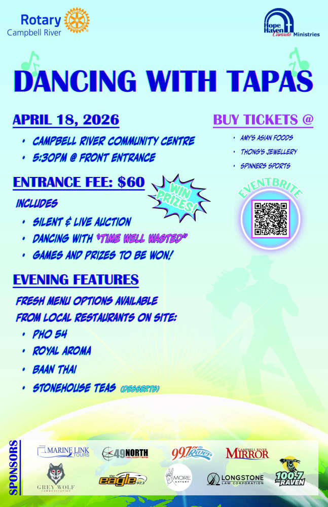 Saturday. April 18th, the Rotary Clubs of Campbell River presents ‘Dancing and Tapas’, a Campbell River Wheelchairs & More Fundraiser at the Campbell River Community Centre.