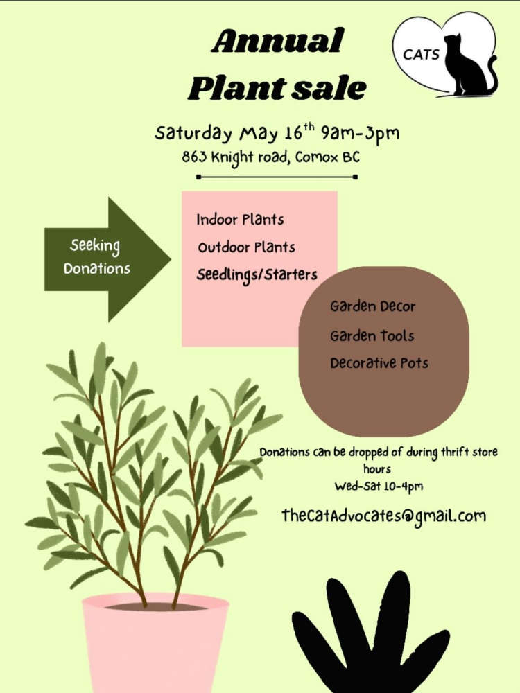 Saturday, May 16th, our friends with CATS, the Cat Advocates Teaching & Saving Society, are holding their annual Plant Sale fundraiser, at the shelter in Comox.