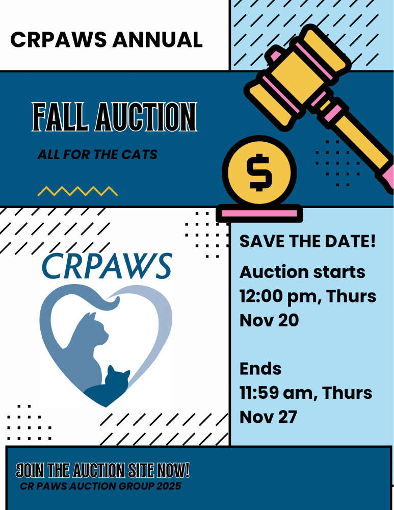It’s that time of year again, November 20th-27th, CR Paws is holding its annual Fall Auction Fundraiser.