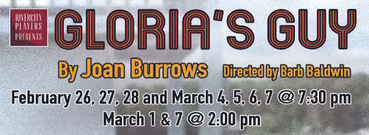 Gloria's Guy by Joan Burrows. Directed by Barb Baldwin and starring Christina Peterson, Cielo Richardson, Kate Humphreys, Amy LaRoque-Walker, Jesse Janzen & Melissa Lanyon. Evening performances at 7:30 PM on Feb 26th, 27th, 28th, March 4th, 5th, 6th, 7th, and matinee performances at 2 PM on March 1st and 7th. Tickets are $27.