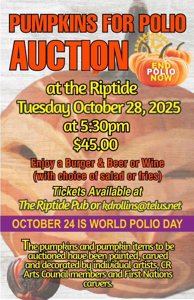 World Polio Day is October 24th, when global health experts & partners share progress on the road to polio eradication from the great work of Rotary Clubs around the world. Enjoy a burger with a beer or wine, your choice of salad or fries & bid on pumpkins, expertly carved by members of the Campbell River Arts Council, Crow’s Nest, individual artists & talented First Nations carvers. It starts at 5:30m, tickets are $45 available the Riptide or by emailing Kim Rollins, with proceeds benefiting the Rotary Club of Campbell River.