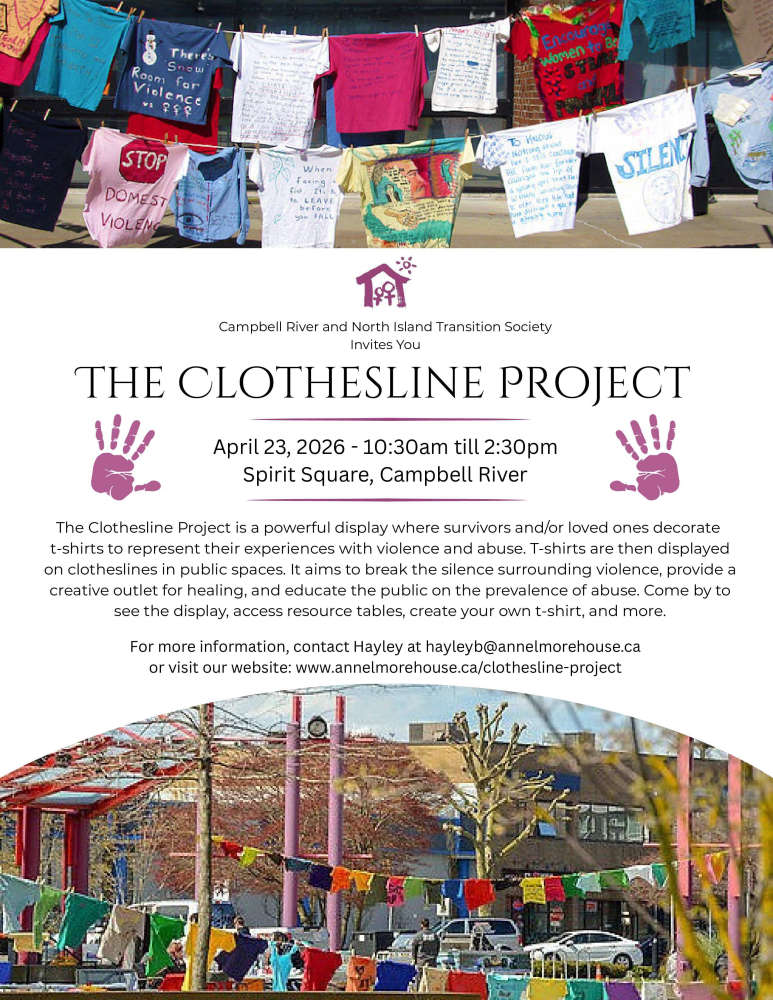 The Clothesline Project is a powerful display of decorated t-shirts created by those who’ve been affected by abuse. The Clothesline Project takes place in communities all over the world & is hosted locally by the Campbell River & North Island Transition Society. All members of the community are invited to Spirit Square to view the display & decorate a t-shirt on the clothesline. The event’s from 10:30am-2:30pm & everyone’s welcome.
