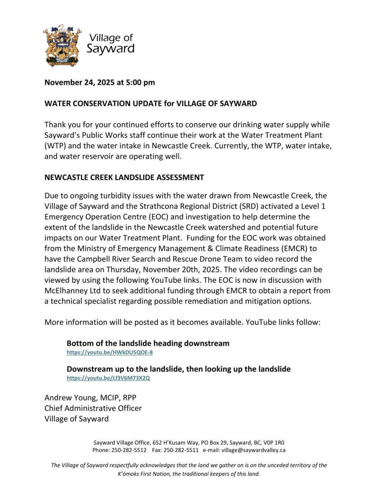 Village of Sayward: Water Conservation & Landslide Update