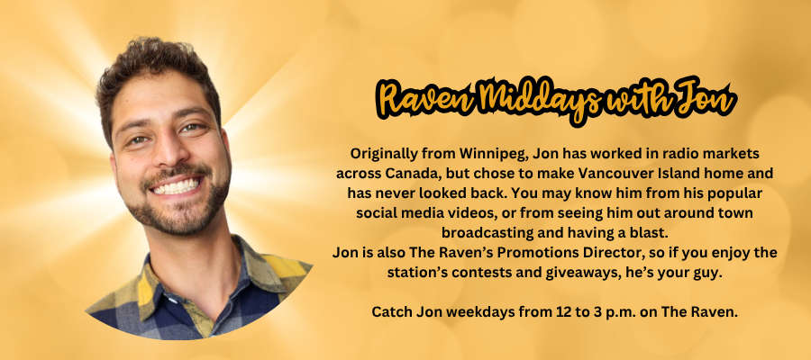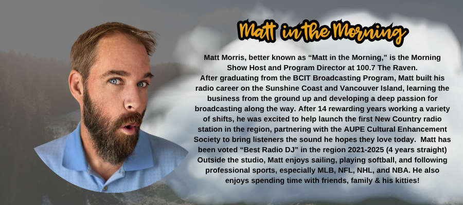 The Raven features new country hits, as well as a mix of contemporary and classic country music. In addition, the station is proud to participate in éy7á7juuthem (Ayajuthem) Indigenous language preservation and growth through industry-leading programs such as Keeping Our Word. Did you know that the Ayajuthem word for "raven" is Poho?